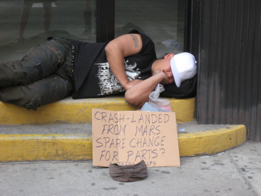 For that short story I’d definitely drop in a few coins and a dollar bill or two. I’ve been hit up for cash from homeless people many times and, even though I always give them some money and a few cigarettes, I always appreciate the ones who put some thought into their 98% fictionalized tales of woe and will give them more $, like this dude here.