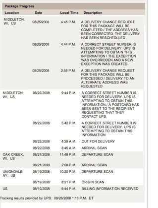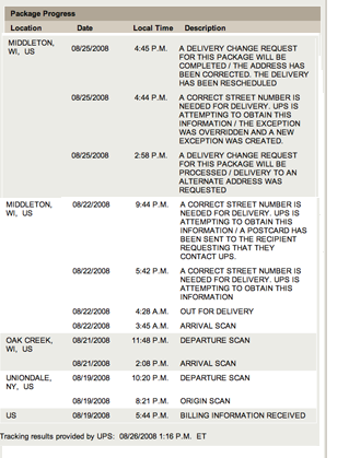 The package was ‘lost’ by UPS. After being not so nice to the rep on the phone about the incorrect address they ‘claimed’ we wrote on the package, we find out from her friends that it was, in fact the incorrect address. Ah, what is a few digits amongst shippers? Having to call UPS back on the 800# what is the shot I would get the SAME rep? Yes, that was a little embarrassing. Nonetheless, he BS’d ‘assured’ me this was being handled and would be delivered on Tuesday.