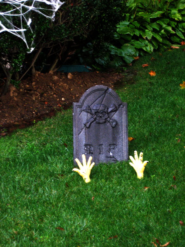 This picture was taken in front of a neighbor’s house. I simply love those little hands. This neighborhood goes all out for Halloween. The decorations are wild. Some are kind of kitsch and subtle like this one and others feel the need to put a huge inflatable spider on their roofs. Or worse, those blow up snowglobe monstrosities (no pun intended) on the front lawn.