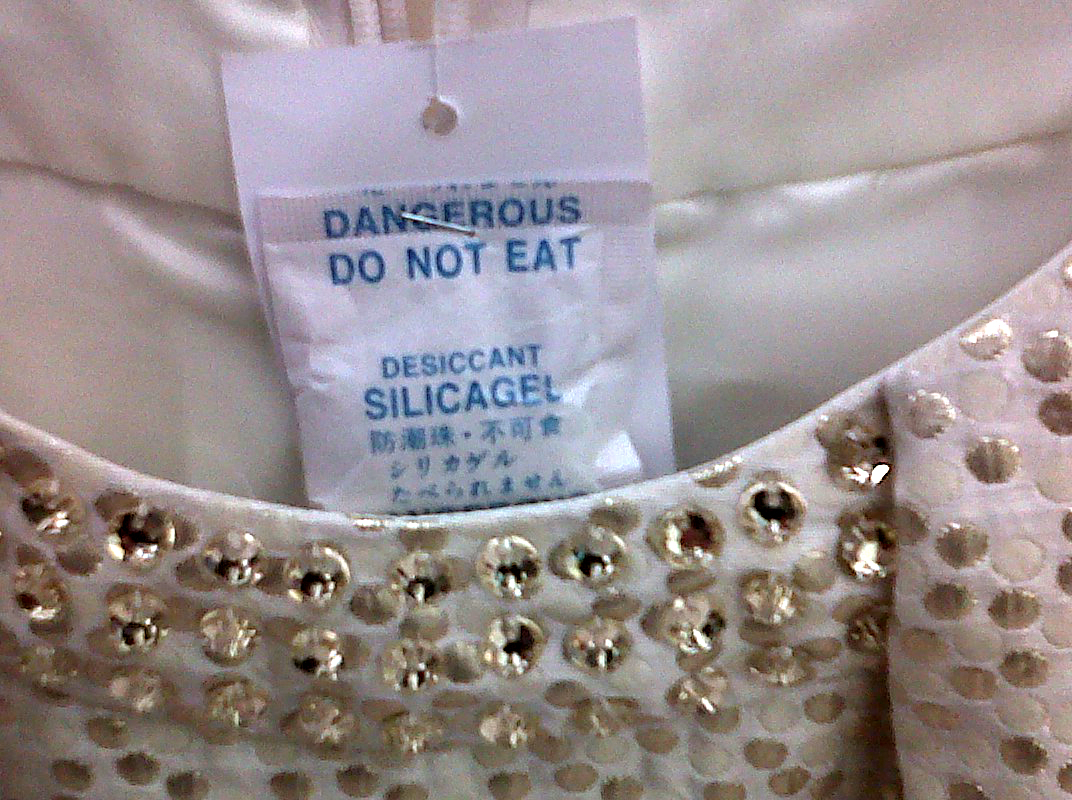 As I was browsing through the racks, I came across this item. Stapled to the inside of a garment was one of those little packs of Silicagel with the words ‘DANGEROUS DO NOT EAT’ printed on it.