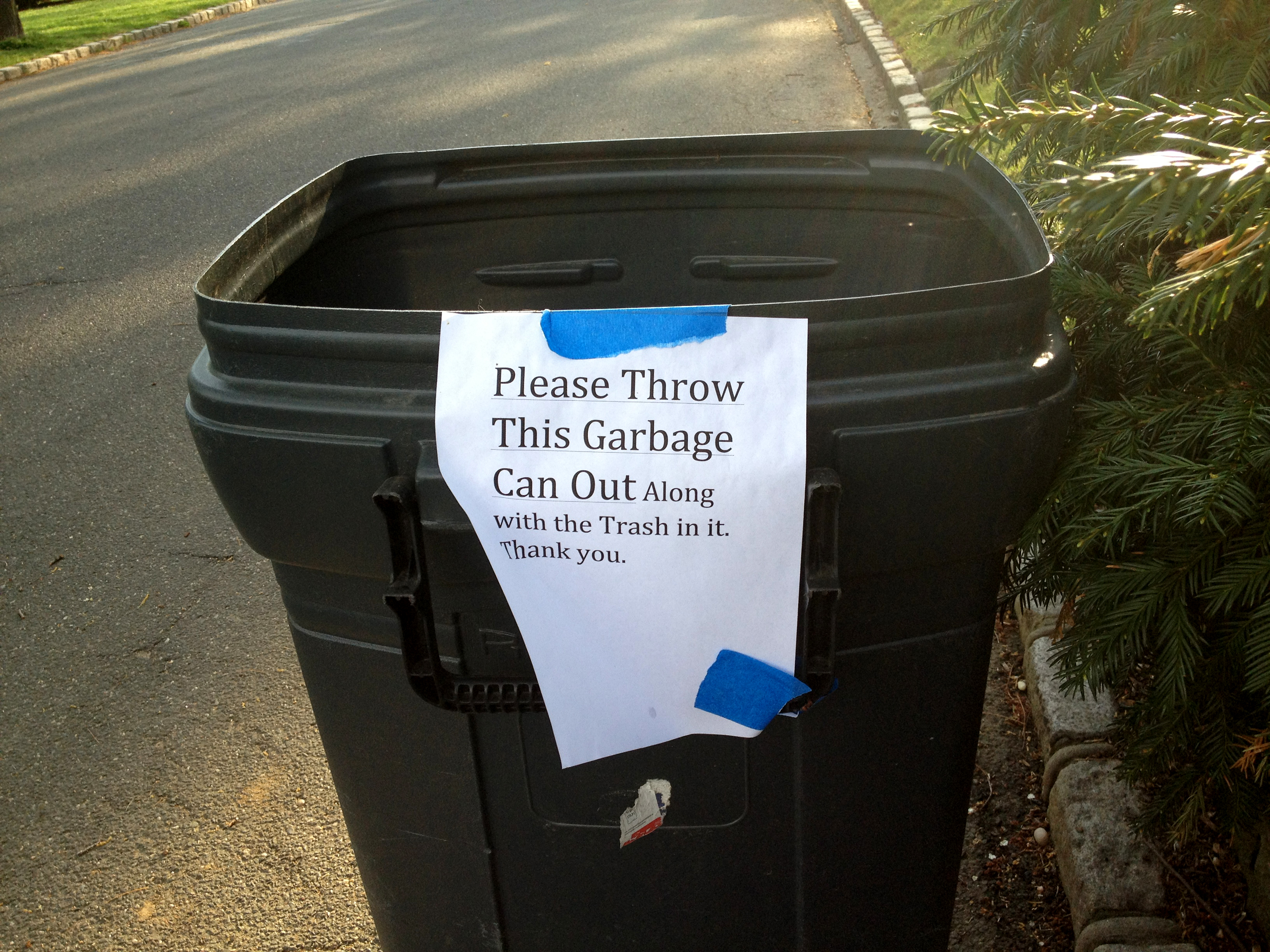 Today I came across this gem. Monday is not a garbage day in my neighborhood. The last pick-up was Saturday. Which means that these people have left this here in hopes that tomorrow’s collection day will bring them some luck. Is it an undocumented phenomenon that it is literally impossible to throw out a garbage can? Notice the contents are gone but the can remains; even with a clearly marked note on the can. Are they not allowed to take the can or is it a big FU for not tipping at the holidays?