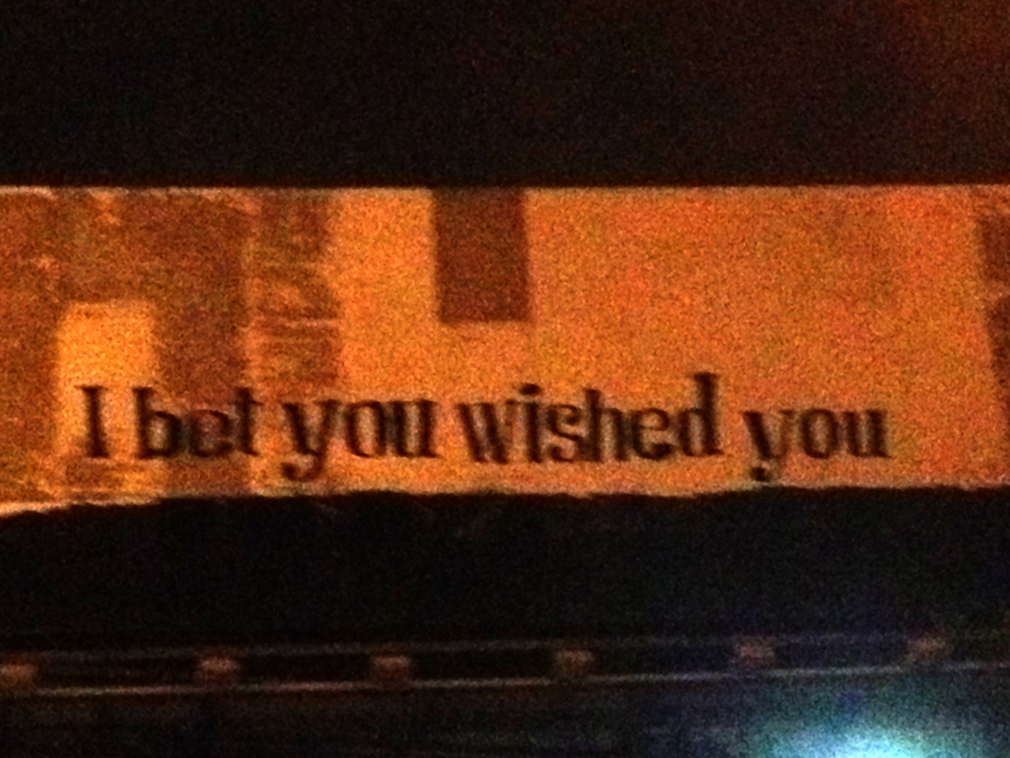 So here is the thing – how many tens of thousands of people pass this sign every day? This is a big commuter corridor, after all. It is going east so I am going to say most people see it on their way home at the end of the day. Does anyone actually SEE it? Do they read it and think, hmmmm, what DO I wish? What do I wish so much that someone would bet on it? And based on the tense of the sentence, what do I wish I had done in the past? Maybe you are a grammar and punctuation junkie (cough, cough, Shelly Kramer), and you wonder why there is no question mark at the end of the sentence. Or you might think, hey, is this a real billboard or graffiti? Or damn, I need to get my phone out fast and take a picture of this one (that would be all you Amytypes out there). I worry that too many people – probably the majority – pay it no mind at all. Which is the whole point of this post.