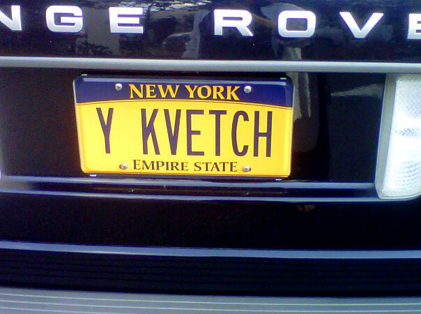 So I figured, hey, Y Kvetch! I love this license plate. I saw it in a parking lot yesterday and laughed out loud. I always wonder, what drives someone to drive something with a plate like this?