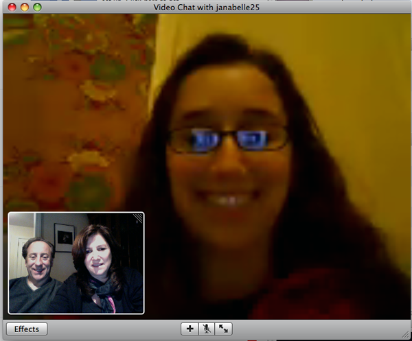Last night we had our first video chat with Jana since she left almost 2 weeks ago. You might imagine that this would have been about really important stuff. Well it was, sort of. For instance, we got to see the way her bathroom light turns on ‘all freaky’. And then she whispered ‘the boy’ into the computer screen as her spanish roommate came by and asked her a question. We got to wave hello to her other roommates and get a tour of her apartment. We talked about everything and nothing with her. Better than IM or texting, this was my kid with all her subtleties and nuances; her humor and expressions. The essence of who she is.