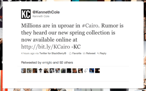 Right now there is a serious situation arising on twitter surrounding a brand that is usually held in very high regard as being socially responsible. The brand is Kenneth Cole. In fairness to the great work they have done, let me first tell you that since 1985 they have been supporters of AIDS awareness and research as well as various other social issues. They created the Awearness Fund, a not-for-profit initiative that uses partnerships, merchandise, events and its blog to celebrate, encourage and empower acts of service volunteerism and social change. A full 100% of net proceeds of the Awearness products go toward the fund.