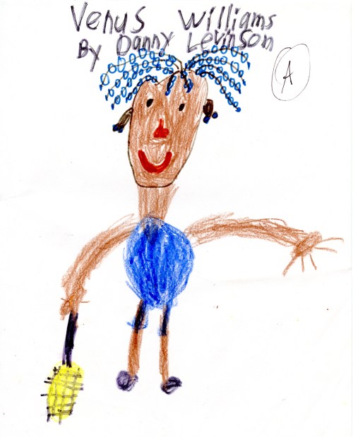 This week we did. With a ‘You are the Best Mom in the Universe’ card, diaries, handmade books, photos and the ever famous Venus Williams report with the picture above. (note the A… great content and priceless drawing).